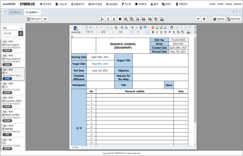 연구노트 작성 뿐만 아니라 연구과제관리 등을 가능하게 합니다. 한글, MS-Office 호환이 가능하고