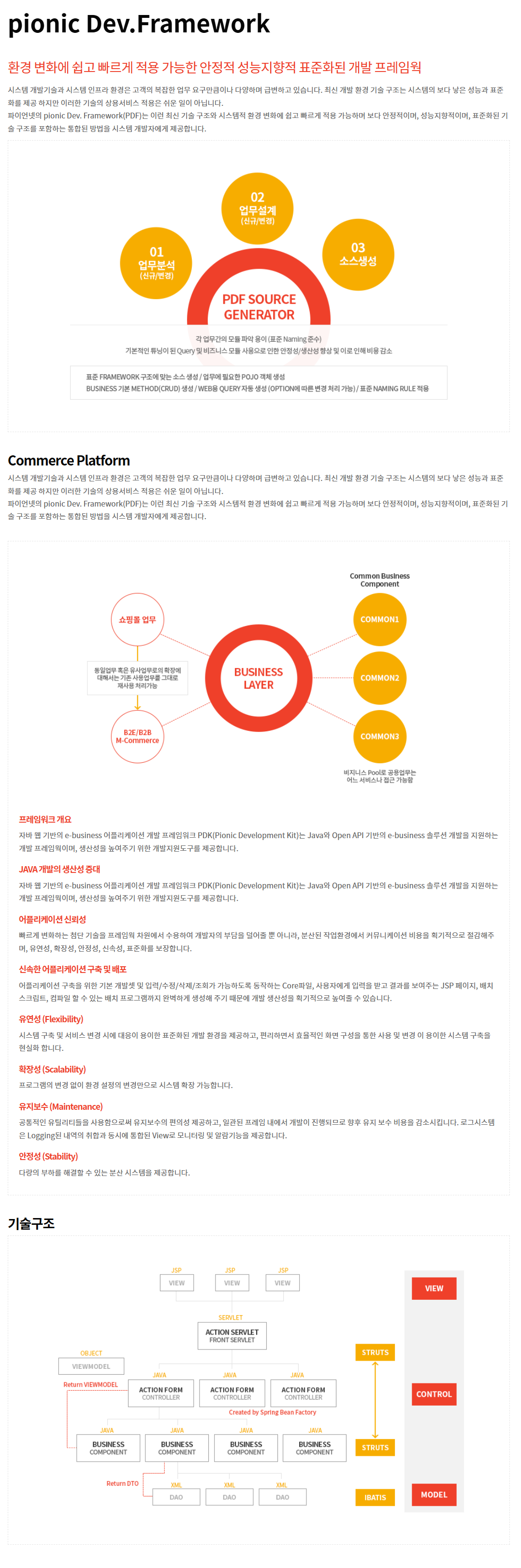 파이언넷의 pionic Dev. Framework(PDF)는 최신 기술 구조와 시스템적 환경 변화에 쉽고 빠르게 적용 가능하며 보다 안정적이며, 성능지향적이며, 표준화된 기술 구조를 포함하는 통합된 방법을 시스템 개발자에게 제공합니다.
